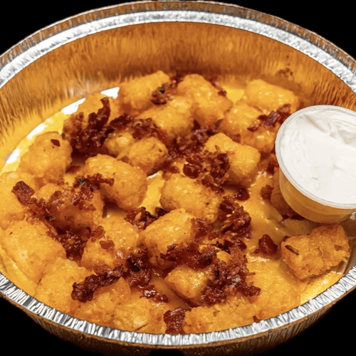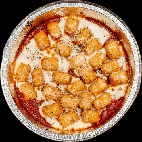 Crispy tater tots over our homemade sauce, topped with melted mozzarella cheese