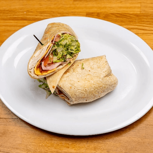 Turkey breast, ham, bacon, and American cheese with lettuce, tomato and mayo, wrapped in a flour tortilla.
