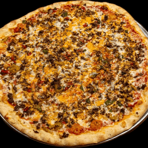 18 inch specialty pizza with shredded beef, onions, sweet and banana peppers with cheddar, and mozzarella cheeses