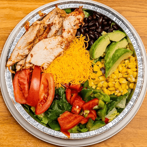 Chicken breast, corn, black beans, peppers, lettuce, shredded Cheddar and BBQ Ranch dressing
