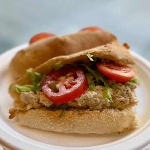 Albacore tuna salad with lemon zest, red onions, celery and dill, with lettuce and tomatoes on a homemade sub roll