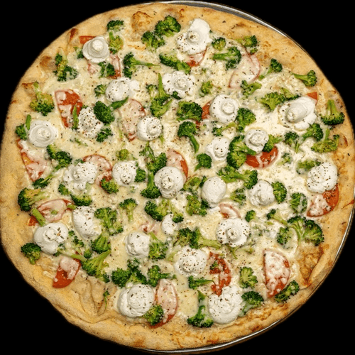 18 inch specialty pizza with broccoli, sliced tomatoes, garlic, Ricotta, and Mozzarella cheeses