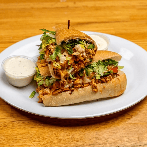 Grilled chopped chicken breast with BBQ sauce, jalapeños, cheddar and Chipotle mayo on a homemade 11 inch sub roll. Served with crispy fried onions.