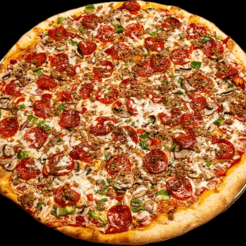 18 inch specialty pizza with pepperoni, sausage, mushrooms, onions, and peppers