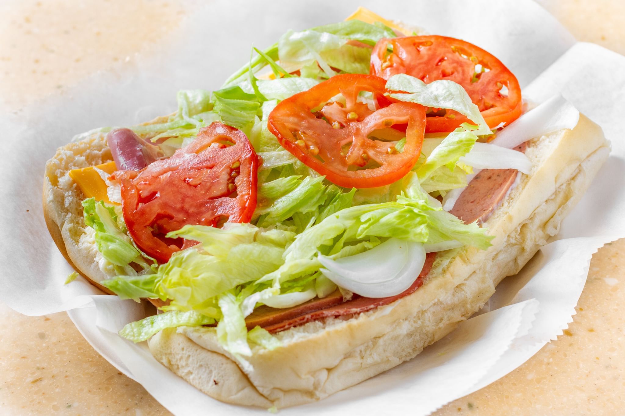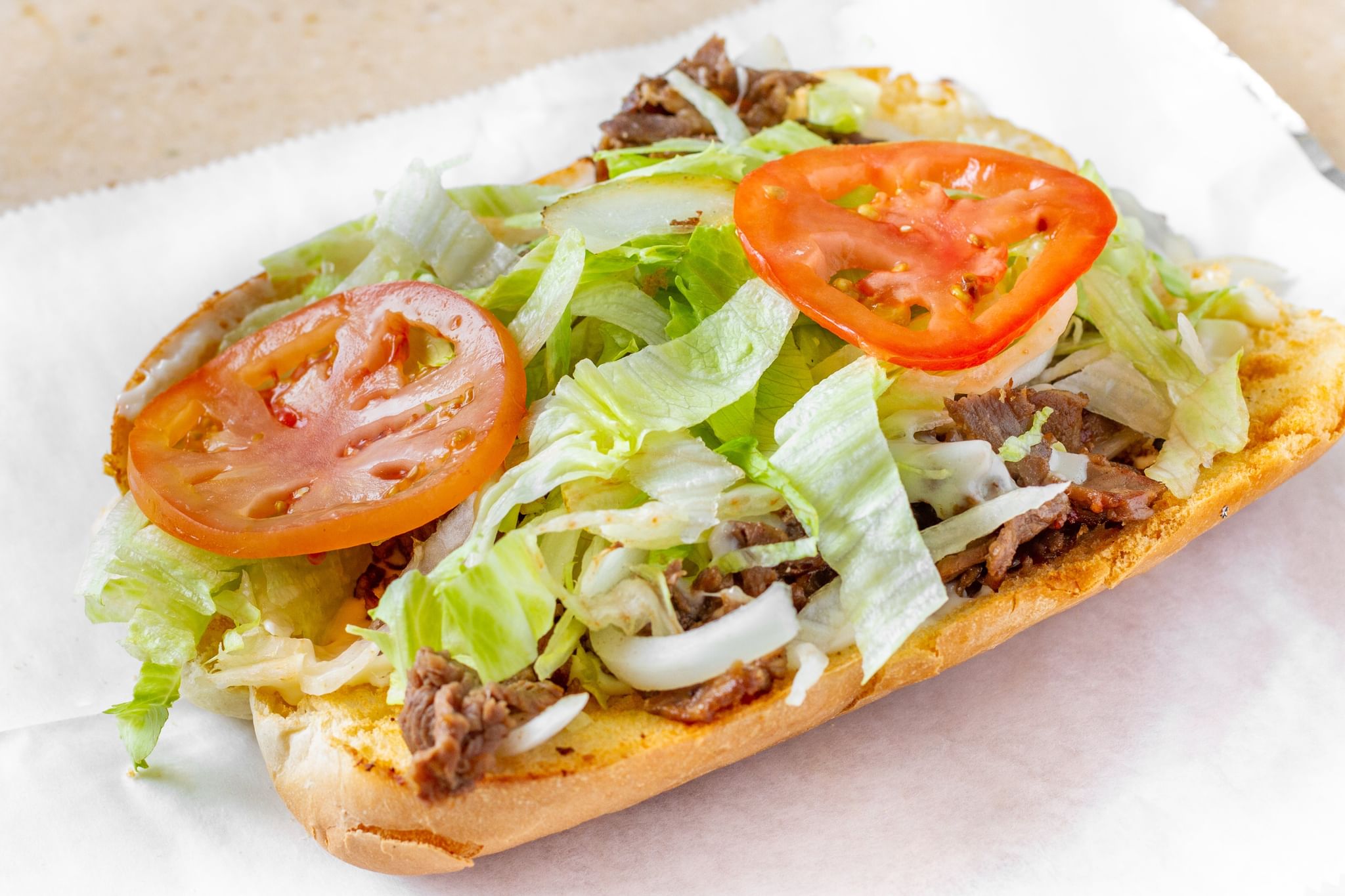 Stuffed with rib-eye steak, lettuce, tomatoes, and American cheese
