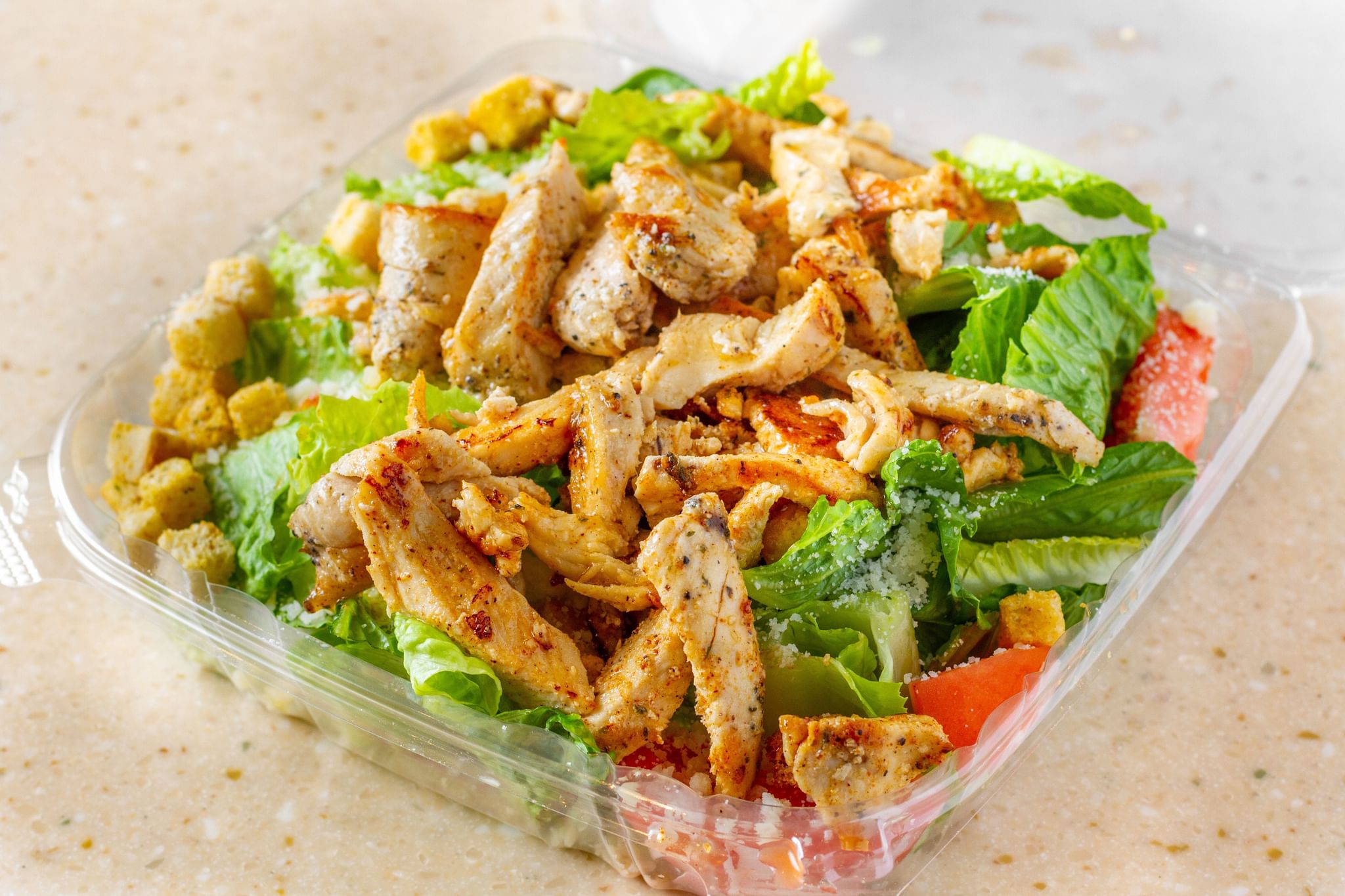 Romaine lettuce, tomatoes, croutons, and Parmesan cheese