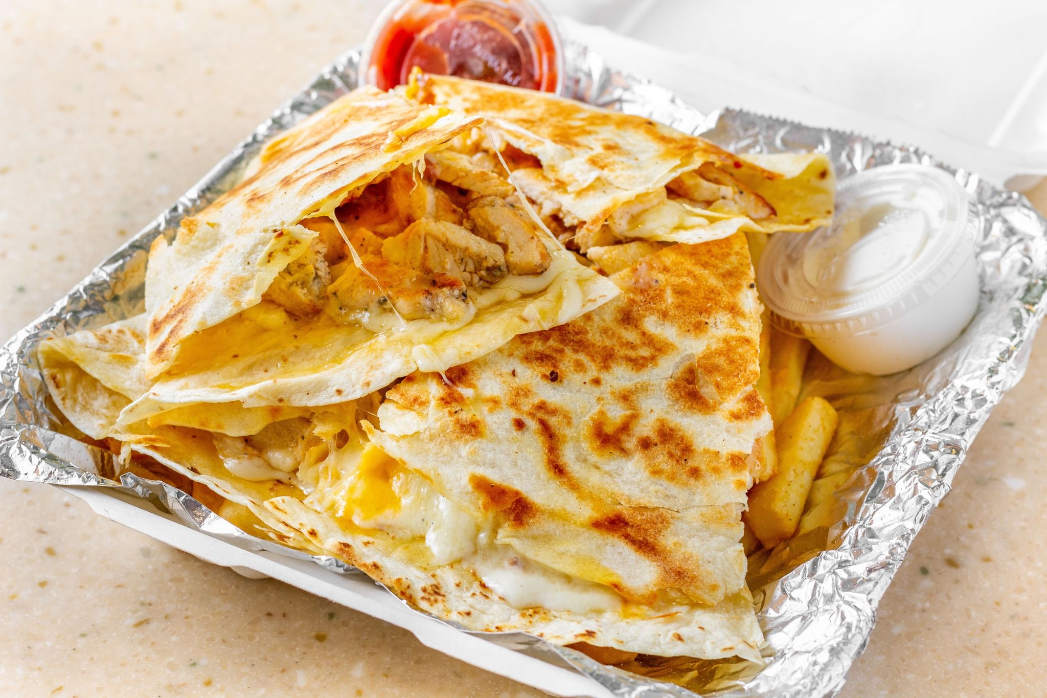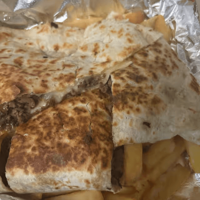 A grilled flour-stuffed tortilla. Served with a side of fries, sour cream, and salsa