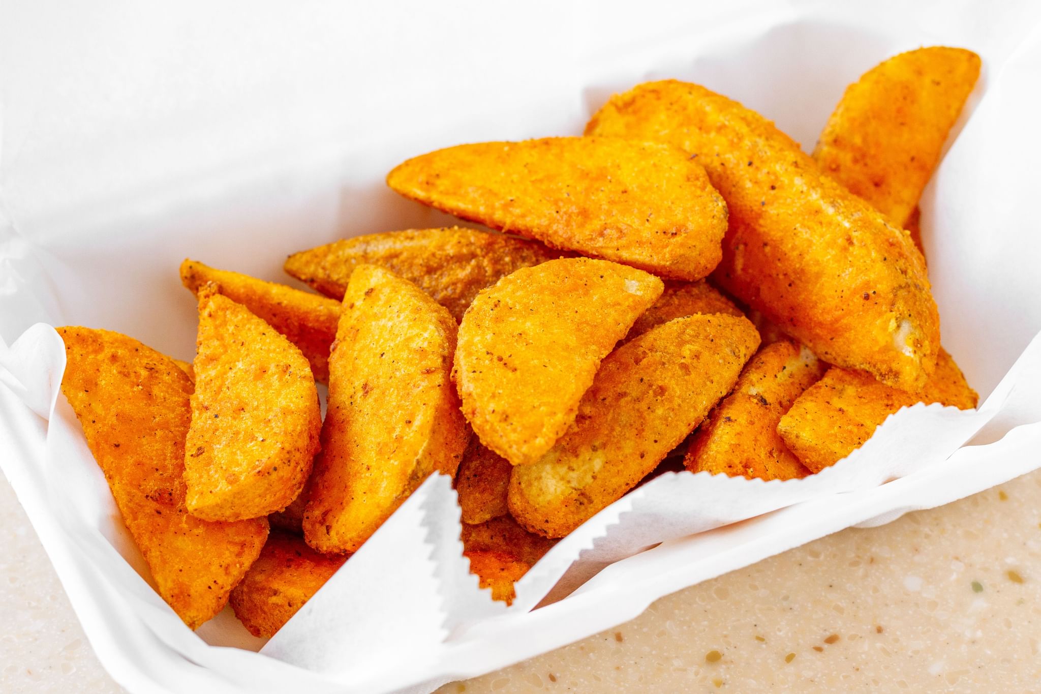 Spiral potatoes seasoned with Old Bay (celery, salt, black pepper, crushed red pepper flakes, and paprika)