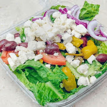 Romaine lettuce, tomatoes, onions, pepperoncini, Kalamata olives, topped with feta cheese, and served with Greek dressing