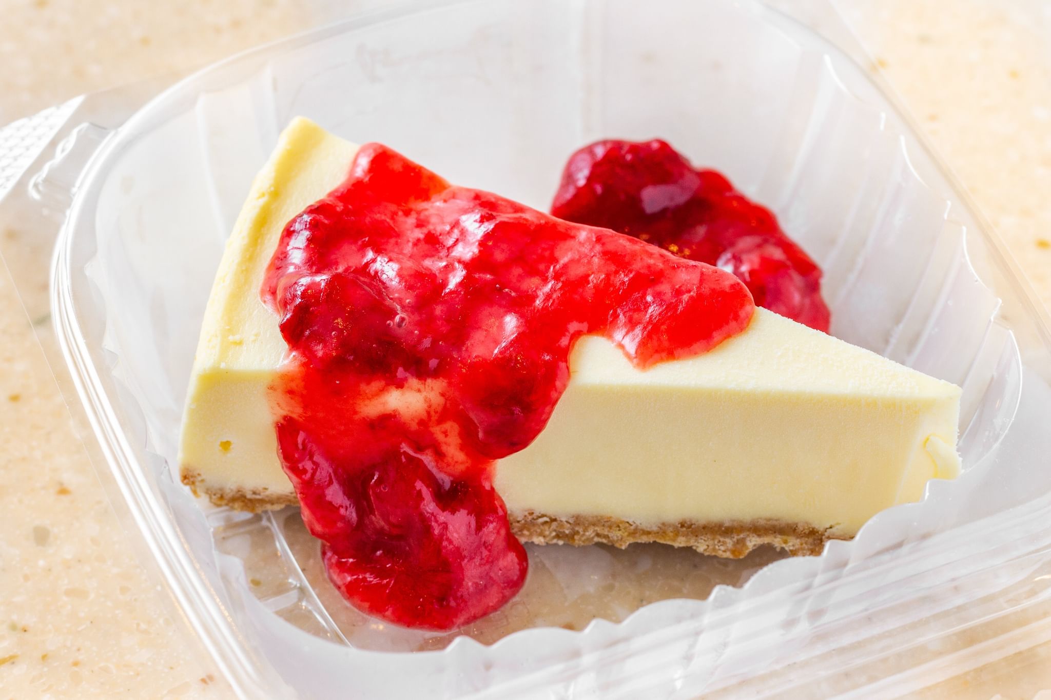 Classic cheesecake with a rich, dense, smooth, and creamy consistency, topped with delicious strawberry
